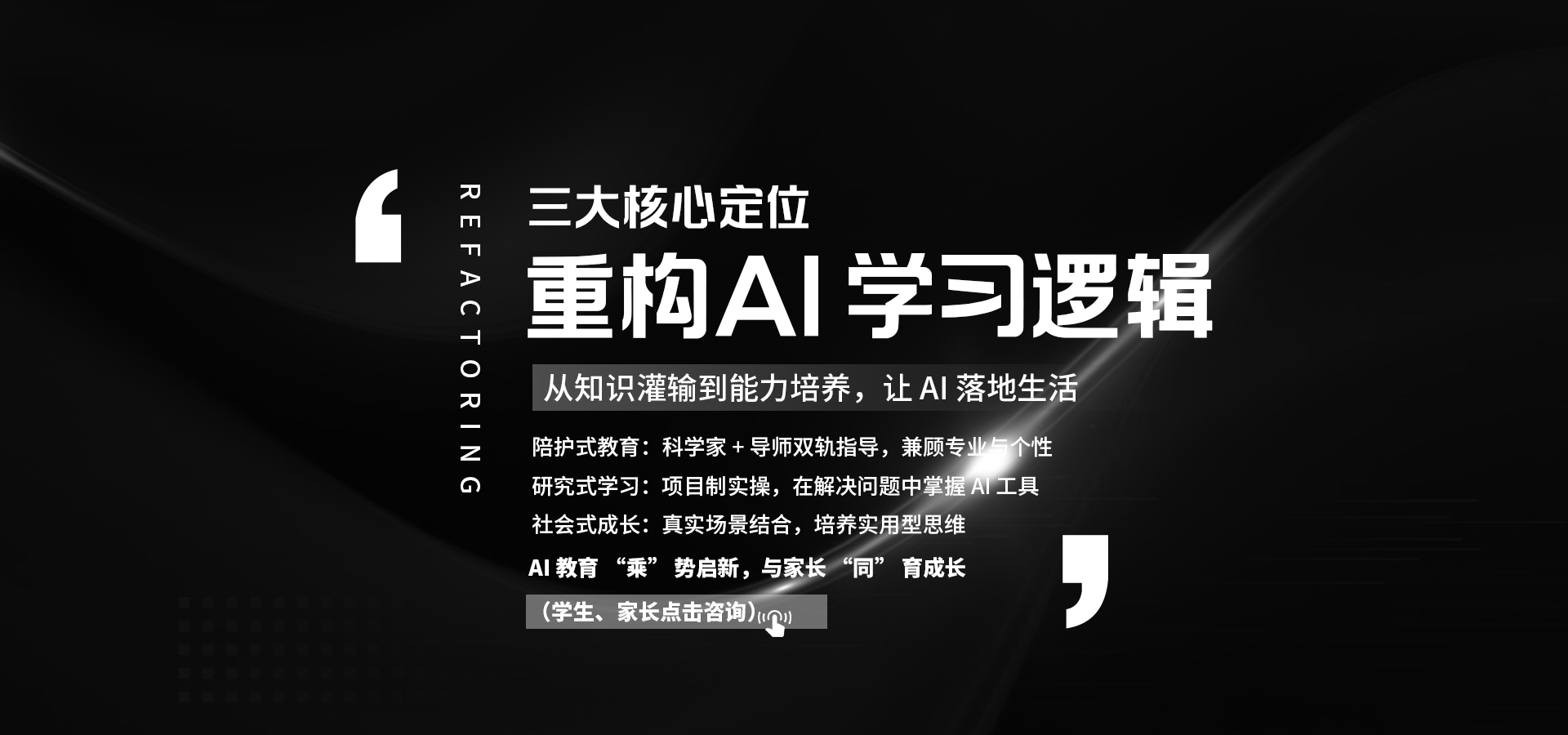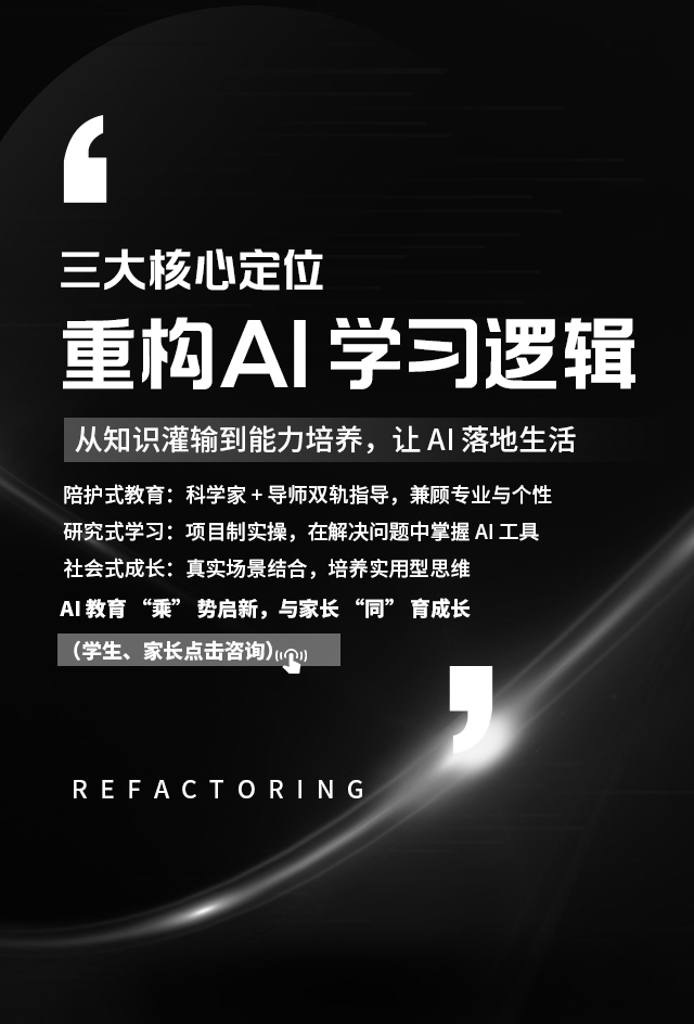 核心业务围绕青少年AI能力培养展开,通过定制化项目设计、场景化实践组织,引导青少年主动运用AI工具,在 “项目拆解 - 方案设计 - 实操落地 - 成果复盘” 的全流程中,激发AI兴趣、挖掘个人特长,提升实际操作与问题解决能力。公司秉持 “青少年AI素养培育是中华民族伟大复兴的先手棋”“少年强则国强” 的理念,助力青少年成长为适配国家科技发展需求的实用型人才。